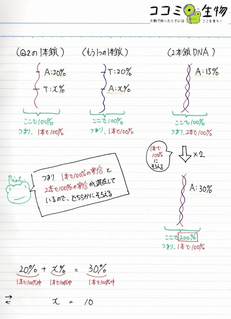 Q2.「Q1」のDNAの片方の一本鎖を調べたところ、Aが20%含まれていた。