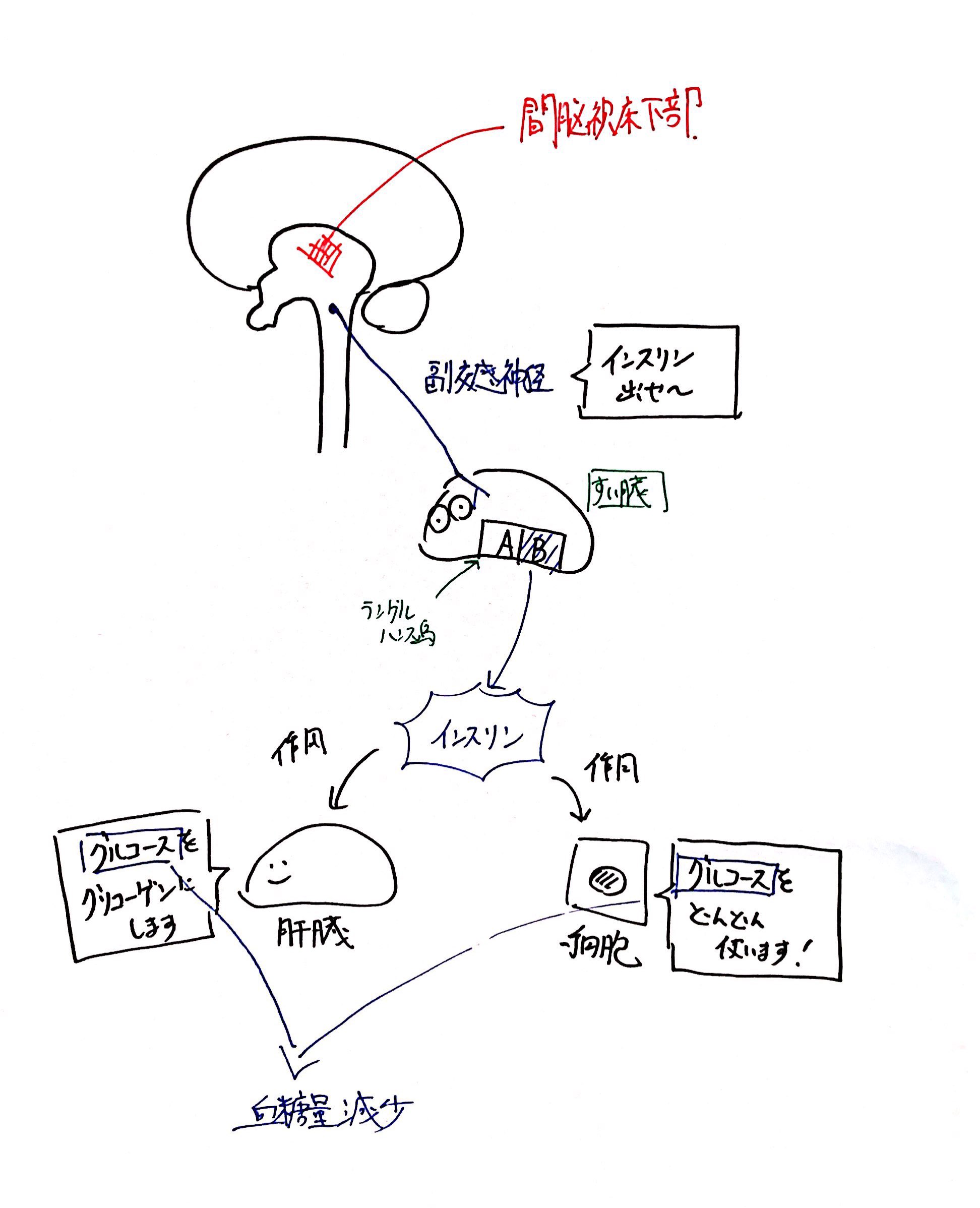この「インスリン分泌命令」は自律神経系の1つである副交感神経を使用して伝達される。