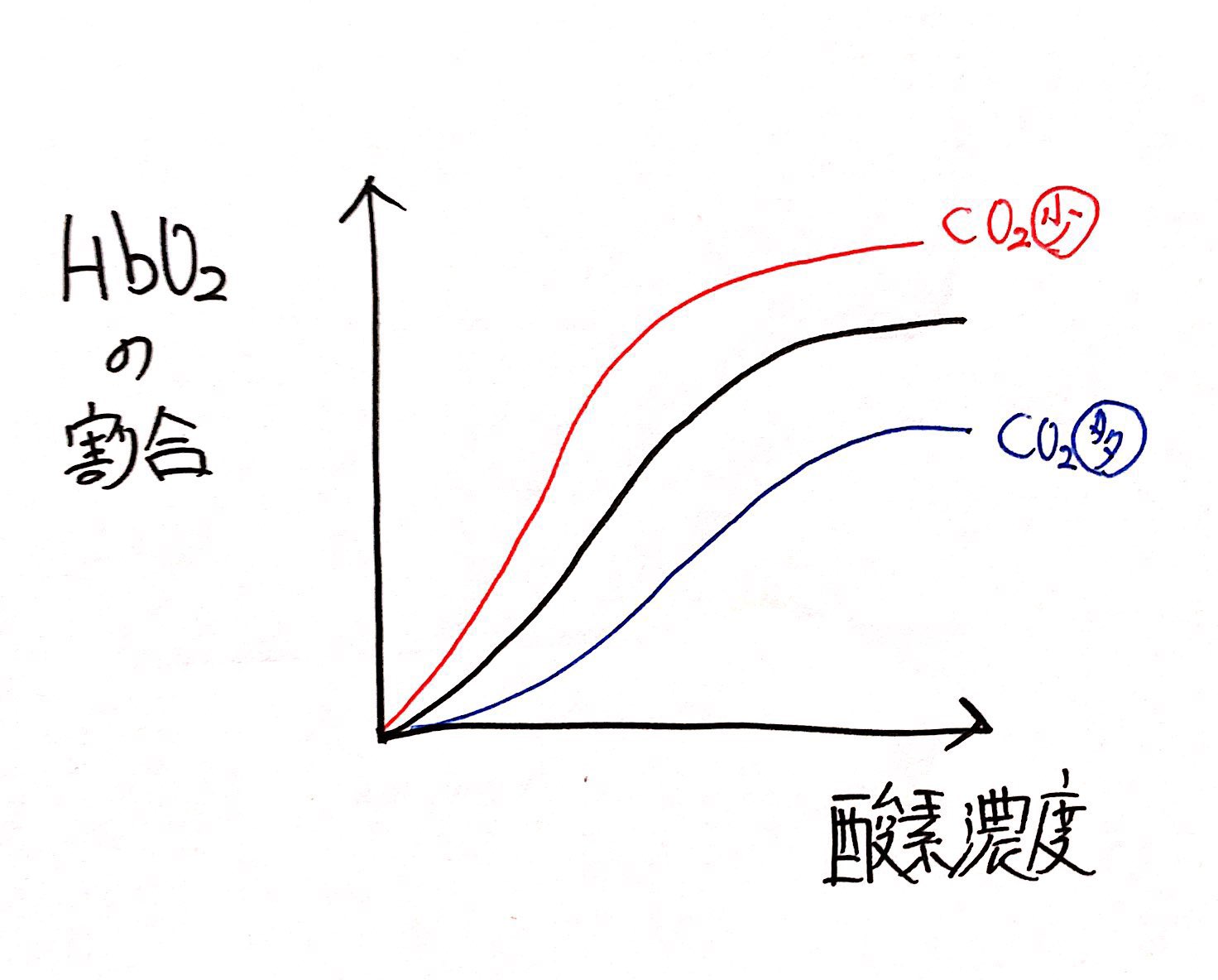 このとき、赤い酸素解離曲線の方が、黒い酸素解離曲線よりも上に来ています。