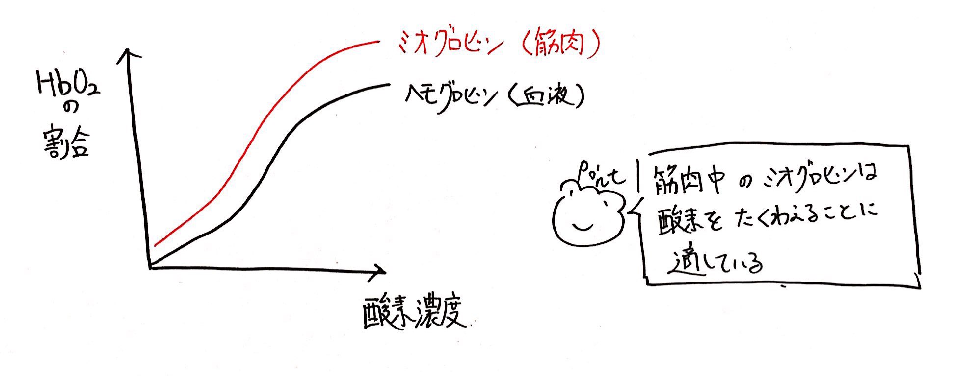 ヘモグロビンは酸素の運搬、筋肉のミオグロビンは酸素を蓄える、という感じですね。