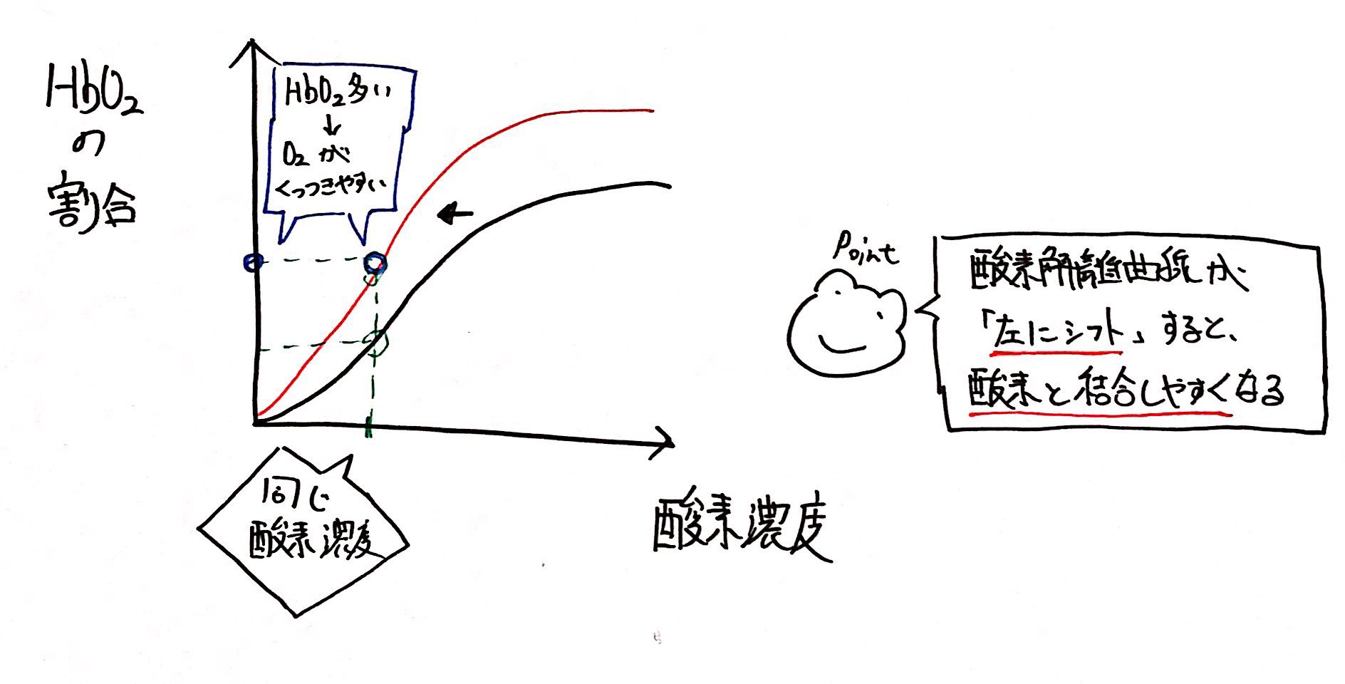 黒い酸素解離曲線が、左にシフトすることで、赤い酸素解離曲線となりました。