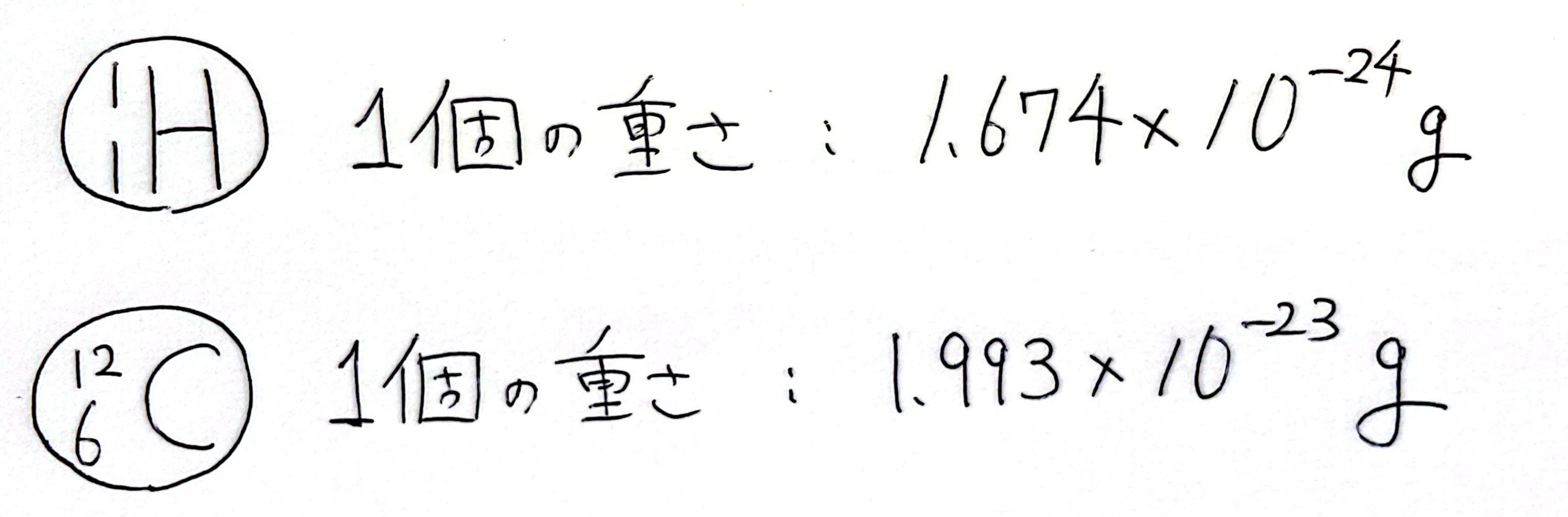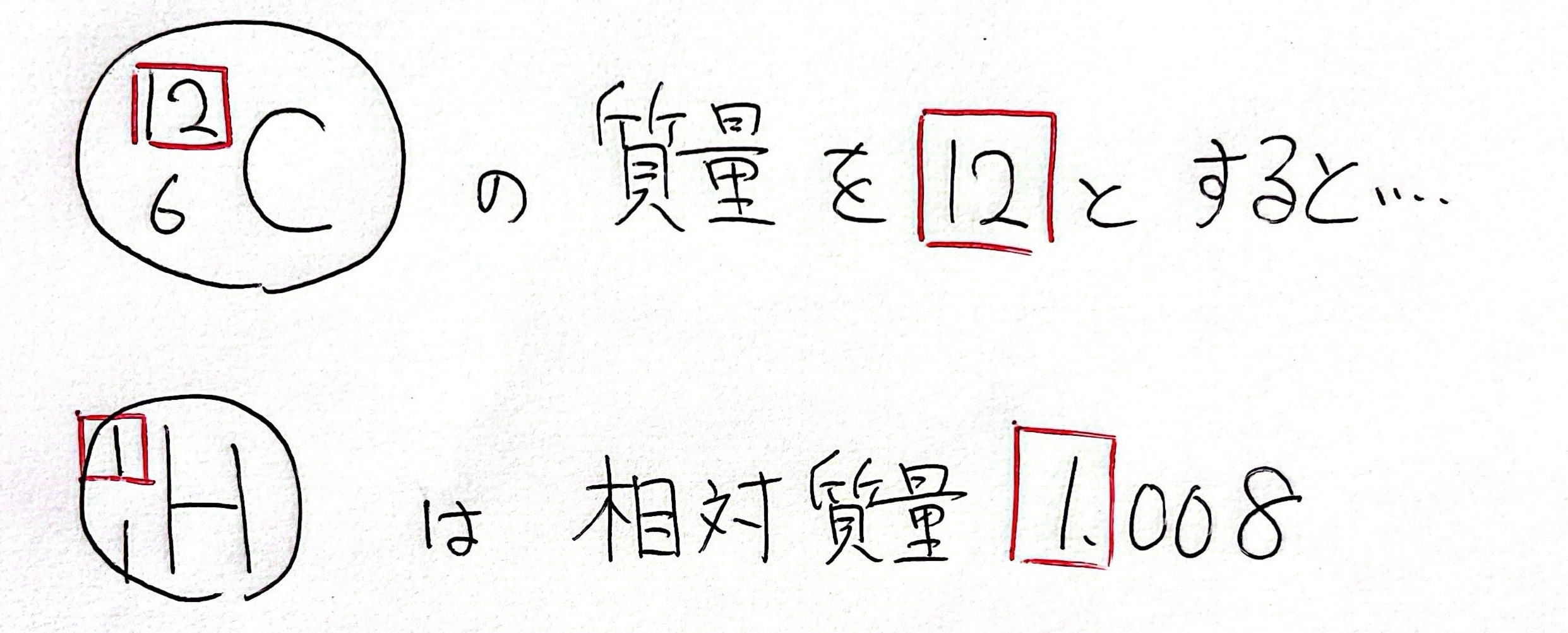 当然最初は「質量数1の水素原子の質量を1とすると・・」とかしてたのですが、そうすると他の原子の相対質量が質量数とずれてしまう。