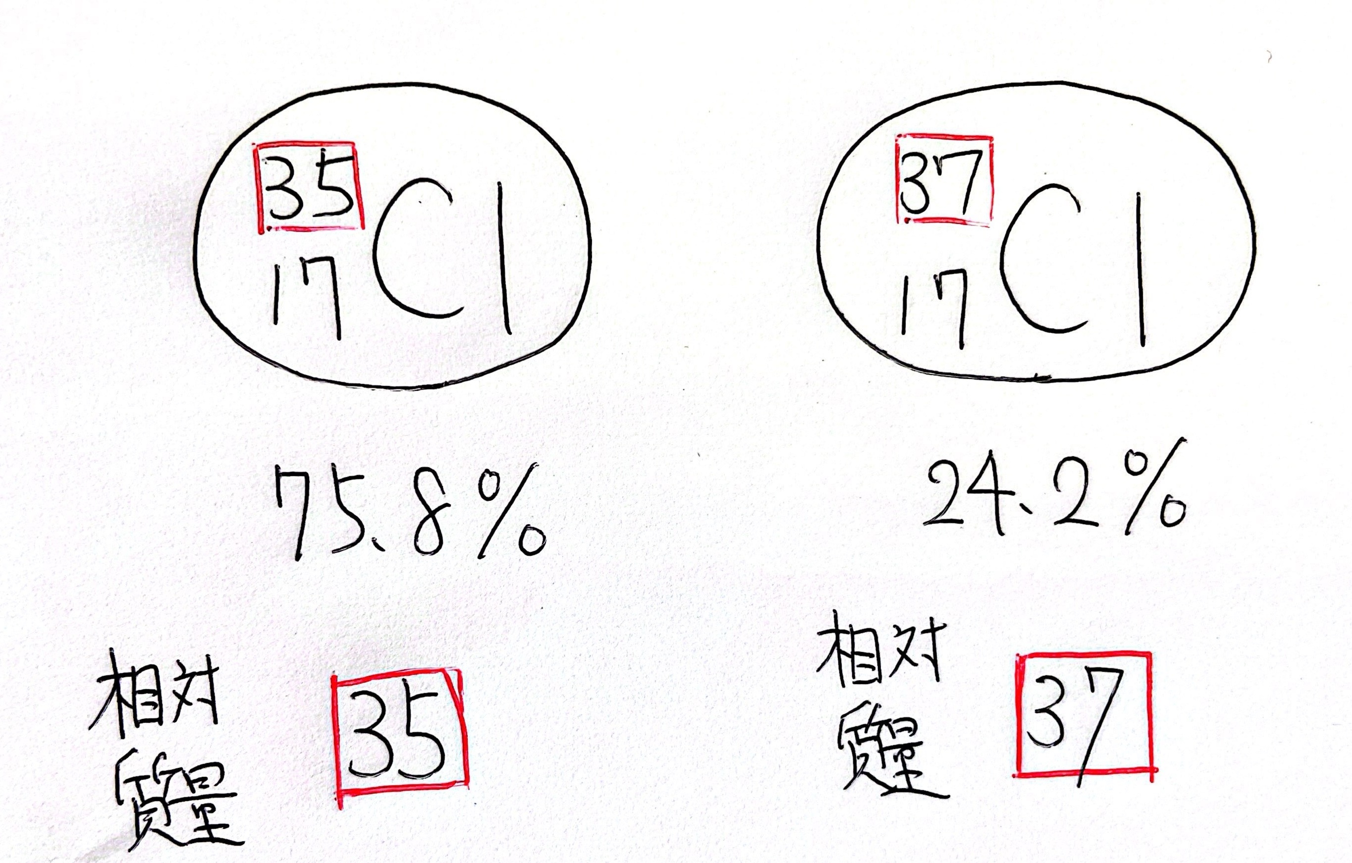 こんな感じで、塩素Cl原子にも質量数35のやつと37のやつがいます。