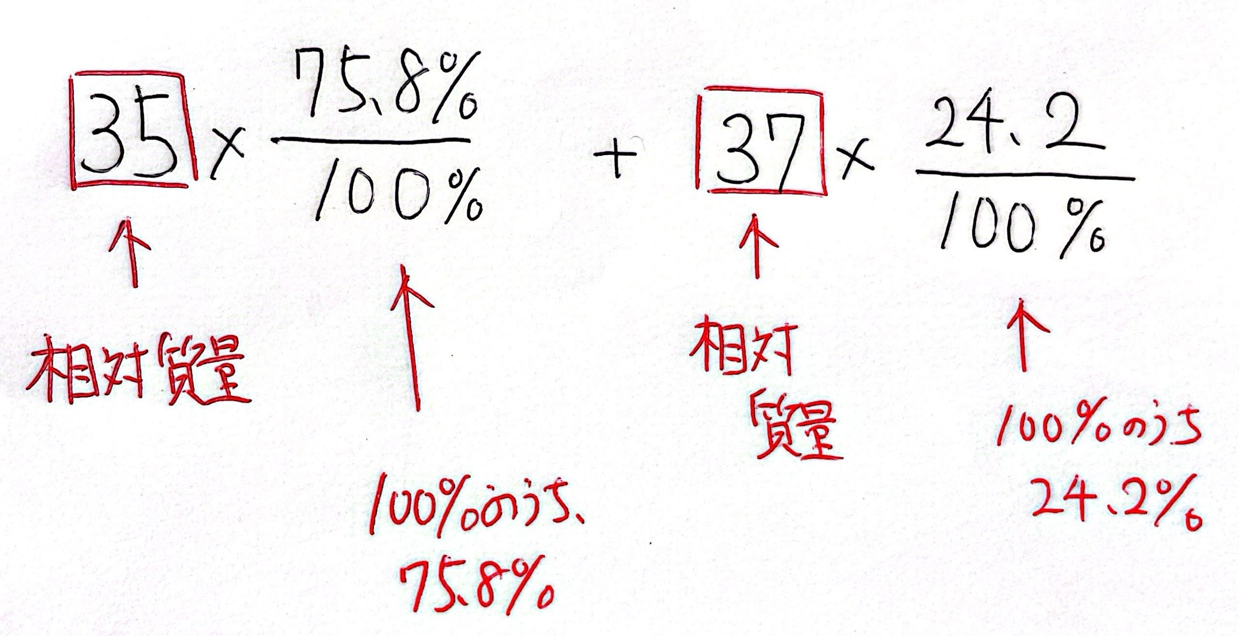 ただ、この質量数と相対質量を一致させているので、塩素を考えるときはどっちにすればいいの?!ってなります。